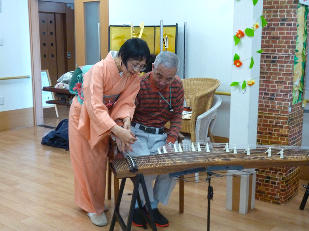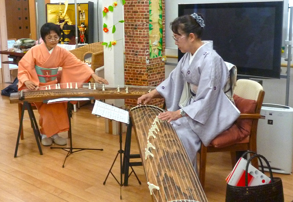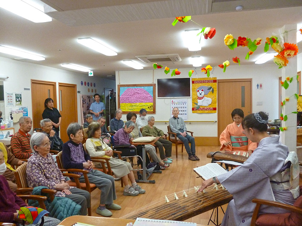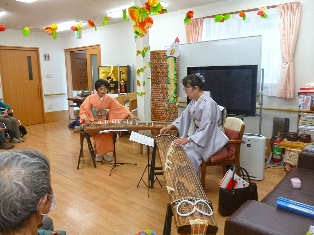 演奏して頂いたのは琴の先生をされているご利用者様のご家族様で、「さくら」や「荒城の月」など日本の名曲、全6曲披露してただきました。