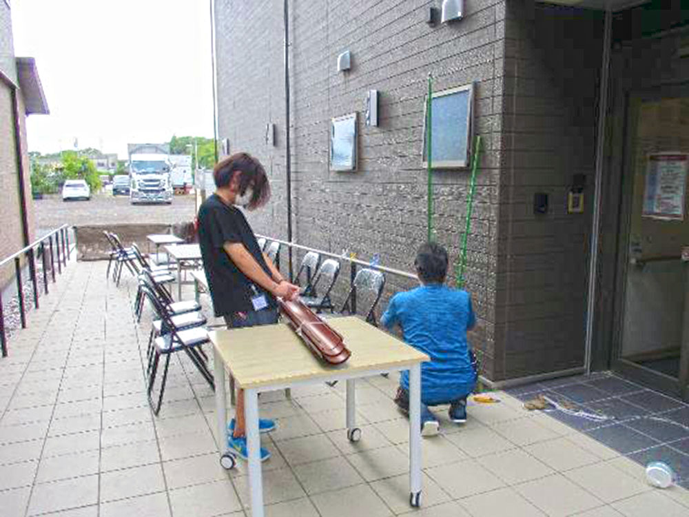 男性職員と管理者で会場づくりをしています。
