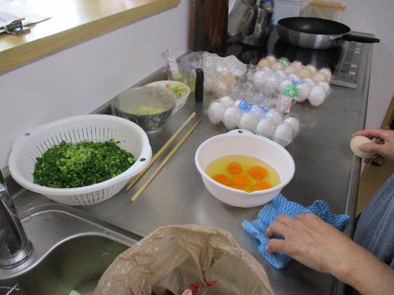 女性職員がそうめんを茹でたり卵焼きの準備をしています。