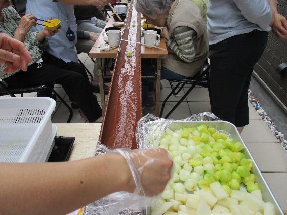 そうめん以外にも🍈メロン、🍊みかんなども流していきます。