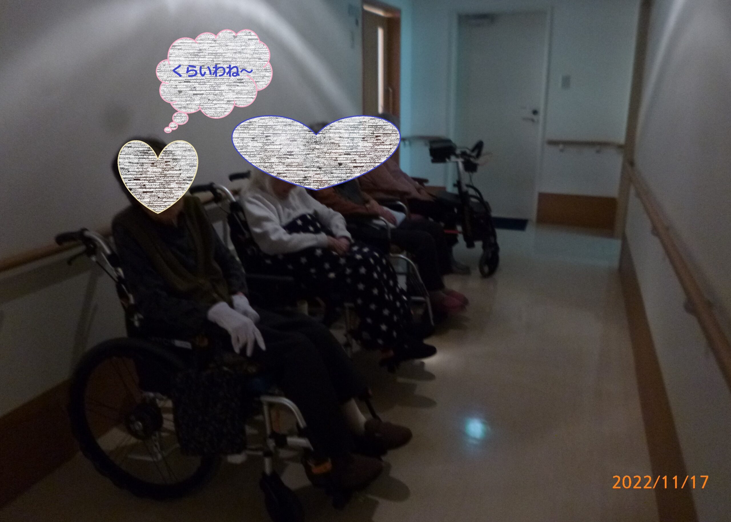 特に通路は窓に面していないため、昼間でも非常灯だけでは暗いのだな…と再認識。