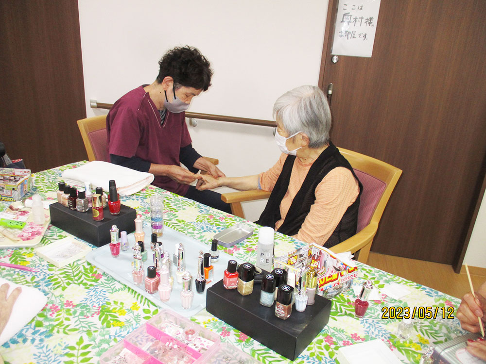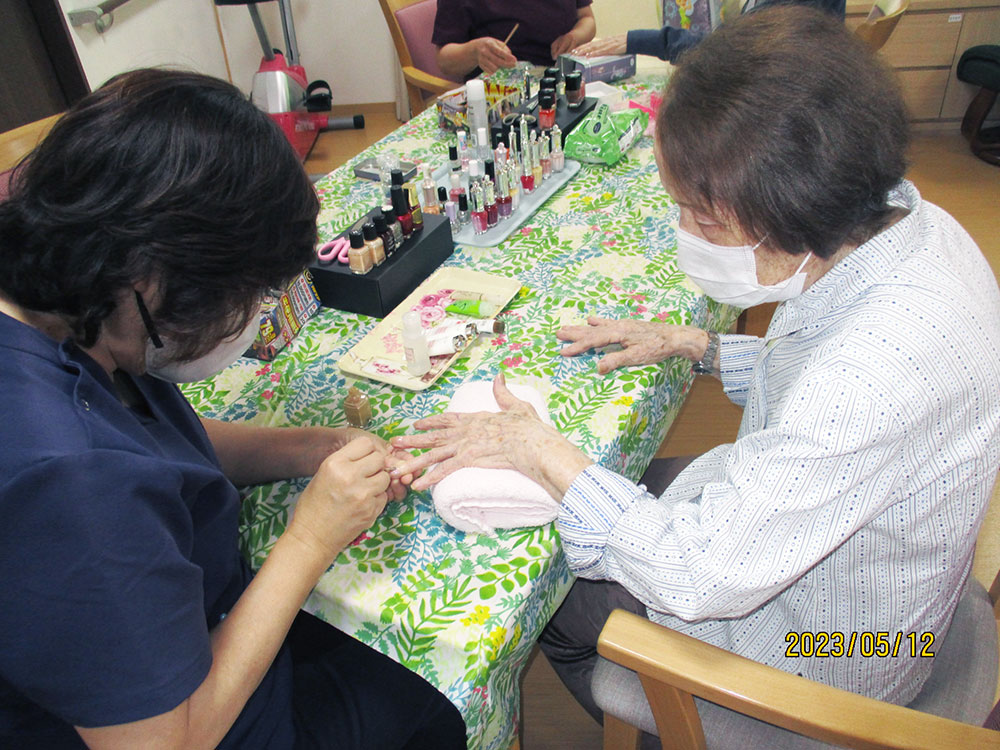 職員がネイルを担当し、皆様が好まれる美しいデザインをネイルに施して仕上げました。