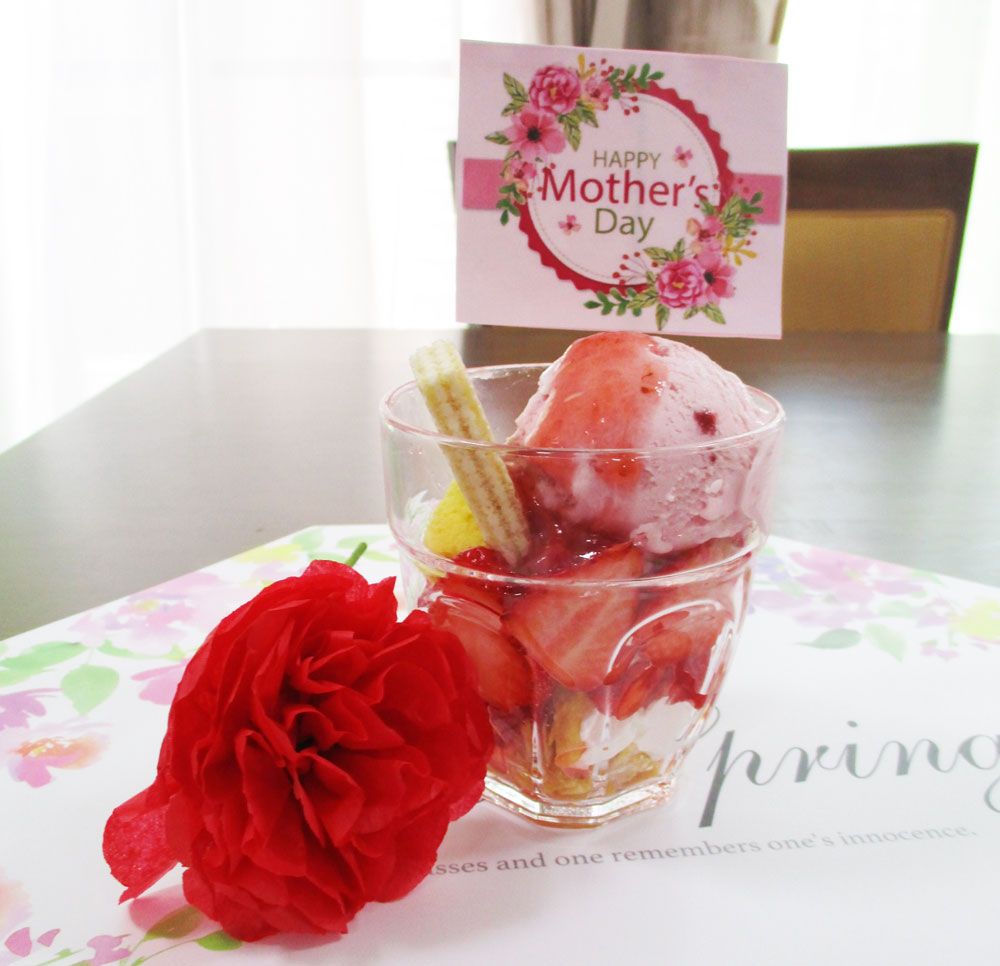 写真撮影の後は母の日をテーマにしたストロベリーアイスのパフェを皆様に召し上がっていただきました。