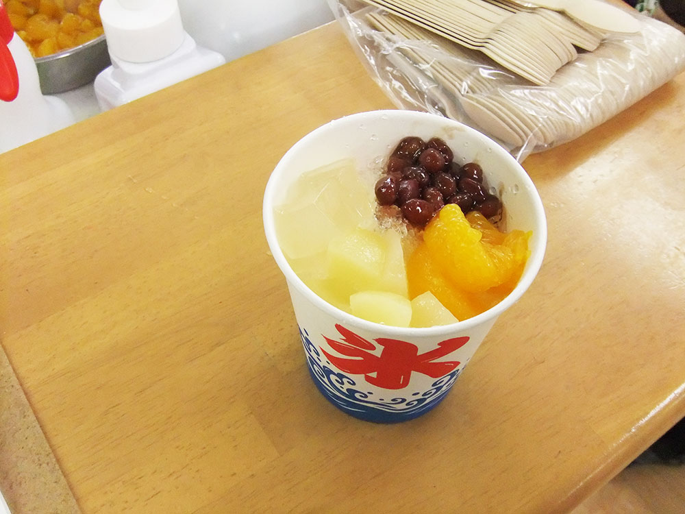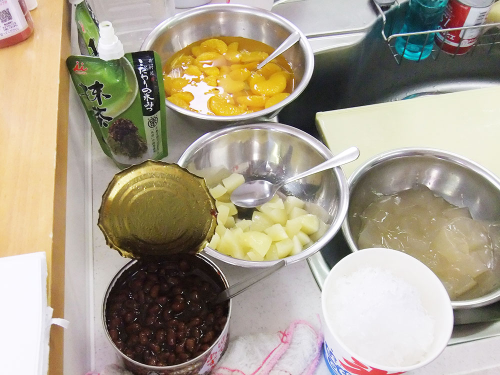 シロップは、抹茶とイチゴの2種類と練乳をご用意しました。トッピングは、みかんと桃、あずき、ゼリーです。